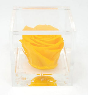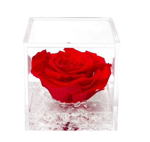 Il cubo in plexiglass effetto vetro, apribile, contiene una rosa stabilizzata di alta qualità, profumate con un delicato olio essenziale e immerse in un gel effetto acqua.