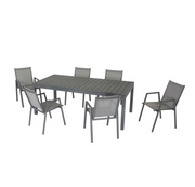 Il tavolo rettangolare allungabile grazie ad un ripiano aggiuntivo raggiungibile tramite l'apertura laterale facilitata, ha una struttura in alluminio antracite e piano in doghe di alluminio antracite, è accompagnato da sei sedie con braccioli, dotate anch'esse di una solida struttura in alluminio antracite e una seduta in textilene grigio scuro.