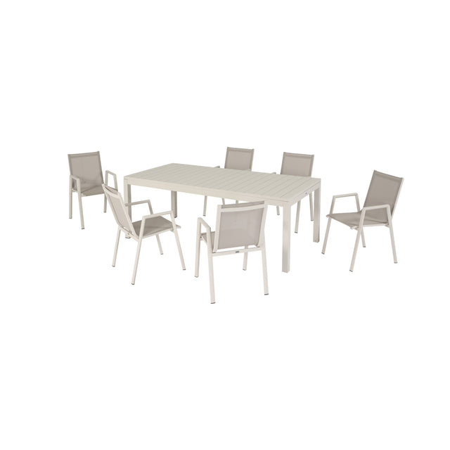 | Materiale e colore tavolo | Struttura in alluminio crema; Piano in Doghe di Alluminio crema |
