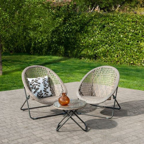 Il set è composto da due poltrone e un tavolino da caffè. Le sedie hanno un design unico a forma ovale sono davvero comodissime. Il set è interamente pieghevole in questo modo occupano pochissimo spazio.