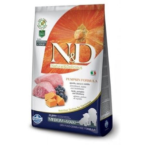 Farmina N&D Grain Free Pumpkin Cane Puppy Medium Maxi Lamb and Blueberries 2,5 kg is a complete dry food for medium to large breed puppies.