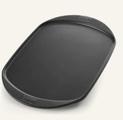 There Weber ceramic plate it has a non-stick surface, the plate becomes very hot and the handles allow it to be easily removed from the grill when it has cooled down.