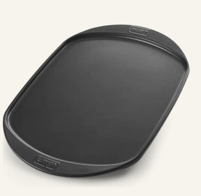 There Weber ceramic plate it has a non-stick surface, the plate becomes very hot and the handles allow it to be easily removed from the grill when it has cooled down.