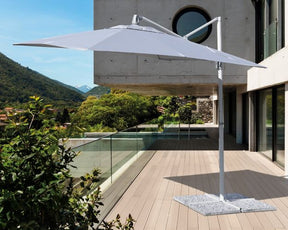 The Terrace garden umbrella is square 225x225cm with side opening. It includes a system of cranks to open it, close it, and adjust the height with an aeration fireplace. It is tiltable and rotates 360 °.